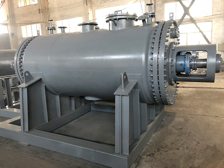 被干燥物料從殼體上方正中間加入,在不斷正反轉動的耙齒的攪拌下,物料軸向來回走動,與殼體內壁接觸的表面不斷更新,受到蒸汽的間接加熱,耙齒的均勻攪拌,粉碎棒的粉碎,使物料內的水份氣化,在真空系統的作用下,使被干燥物料內部水份和表面水份有利的排出,氣化的水份經干式除塵器、濕式除塵器、冷凝器,從真空泵出口處放空。